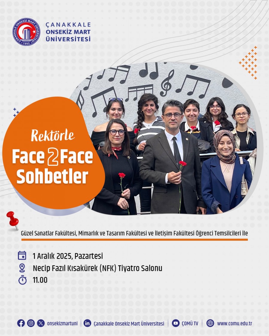 Rektörümüz Prof. Dr. R. Cüneyt Erenoğlu, “Face 2 Face Sohbetler” etkinliği kapsamında öğrenci temsilcileriyle bir araya gelecek. Etkinlik, 1 Aralık 2025 Pazartesi günü saat 11:00’da Necip Fazıl Kısakürek (NFK) salonunda gerçekleşecektir.