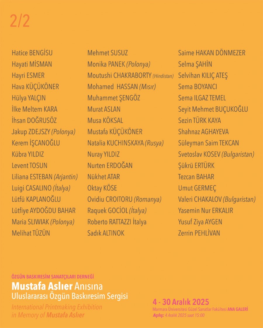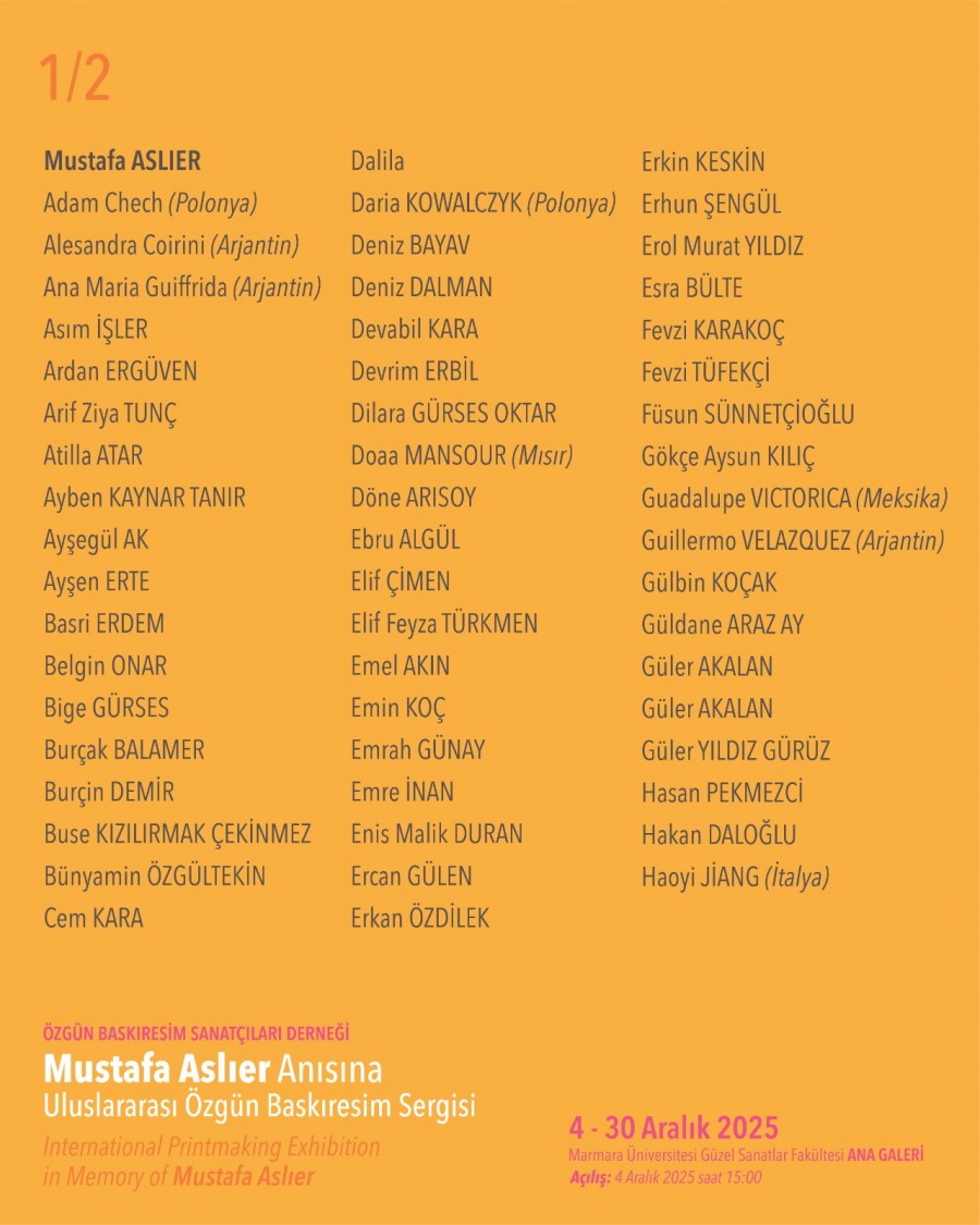 Resim Bölümü öğretim üyeleri Prof. Dr. Hakan Daloğlu ve Doç. Dr. Umut Germeç ile emekli öğretim üyesi Prof. Dr. İhsan Doğrusöz'un katıldığı "Bas Buluş / Print Meet 2025" Mustafa Aslıer Anısına Uluslararası Özgün Baskıresim Sergisi'nin açılışı 4 Aralık 2025 saat 15.00'da Marmara Üniversitesi Güzel Sanatlar Fakültesi Ana Galeri'de gerçekleşecek. Sergi 30 Aralık 2025 tarihine kadar görülebilir.